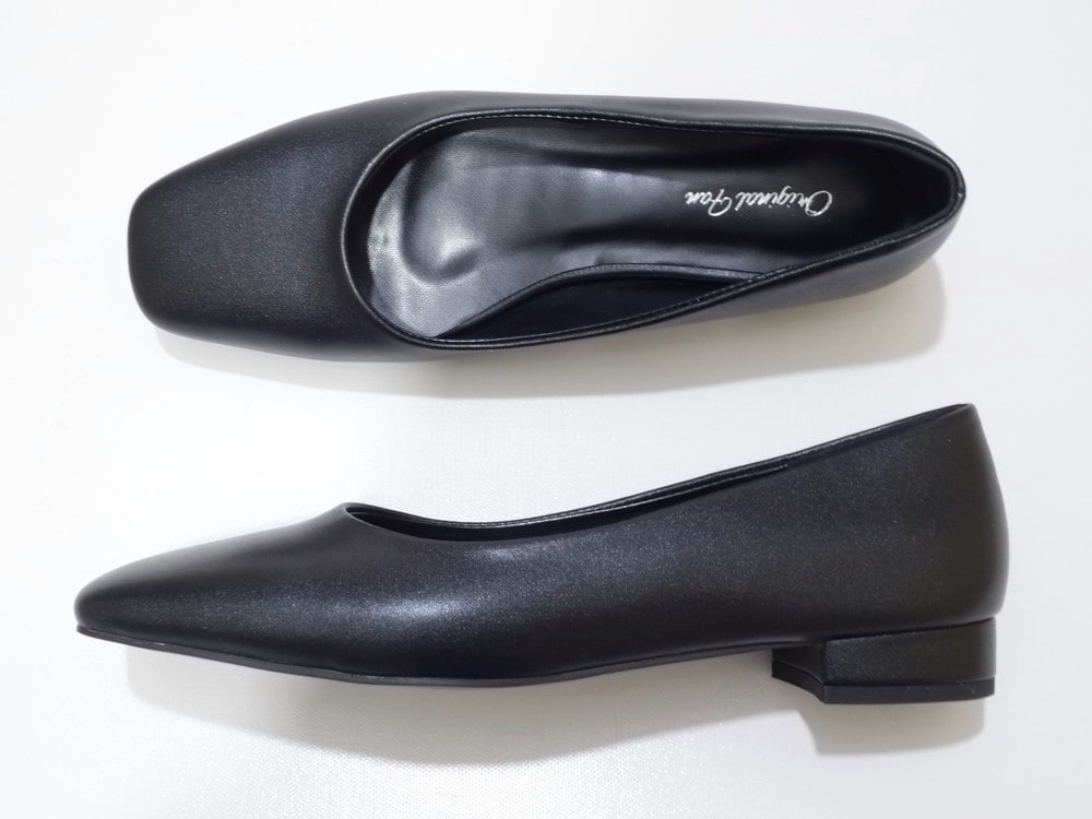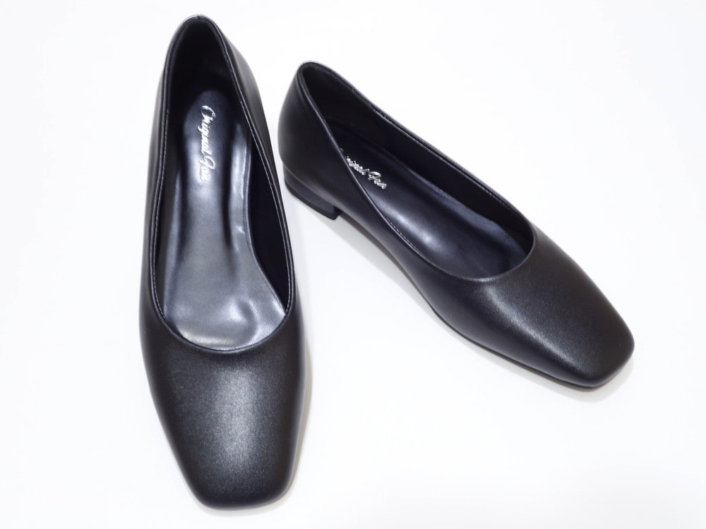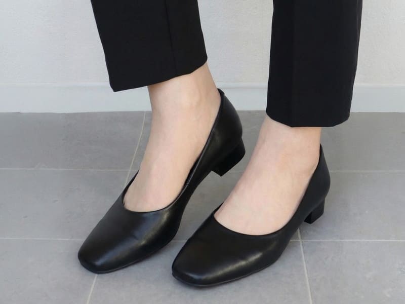 包み込むような安定感ある履き心地のプレーンな幅広スクエアパンプス。普段ヒールに慣れていない方にも歩きやすい、程よい高さのローヒール設計。